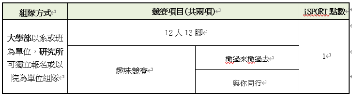 (二)比賽項目及組別:依據本校組織規程系統表,大學部以系或班為單位,研究所可獨立報名或以院為單位組隊,每隊12人。
