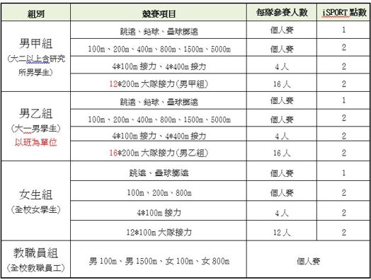 (二)比賽項目及組別:男乙組以班為單位,男甲組及女生組以各學系、研究所為單位。